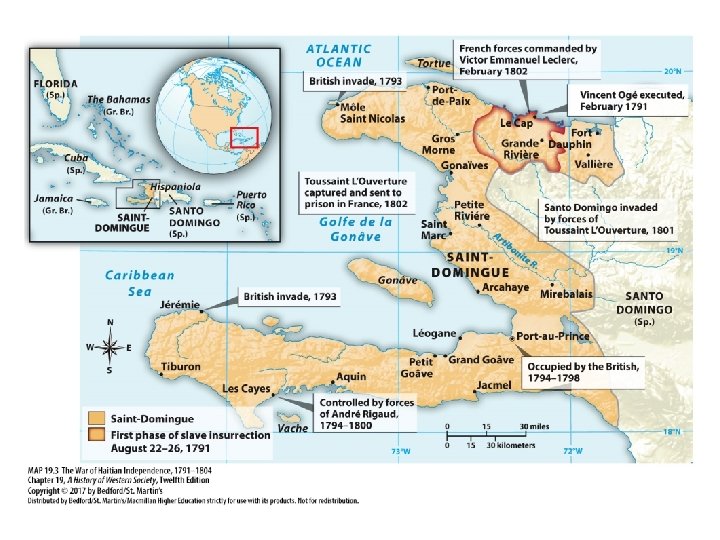 VI. The Haitian Revolution, 1791 – 1804 A. Revolutionary Aspirations in Saint. Domingue 5. Reforms in France inspired hope for enslaved and free people of color 6. Creole elite looked to representative government 7. France reaffirmed monopolies over colonial trade 8. Vincent Ogé and his army 9. Political rights granted to free people of color born to two free parents with property 10. Colonial governor refused to enact it