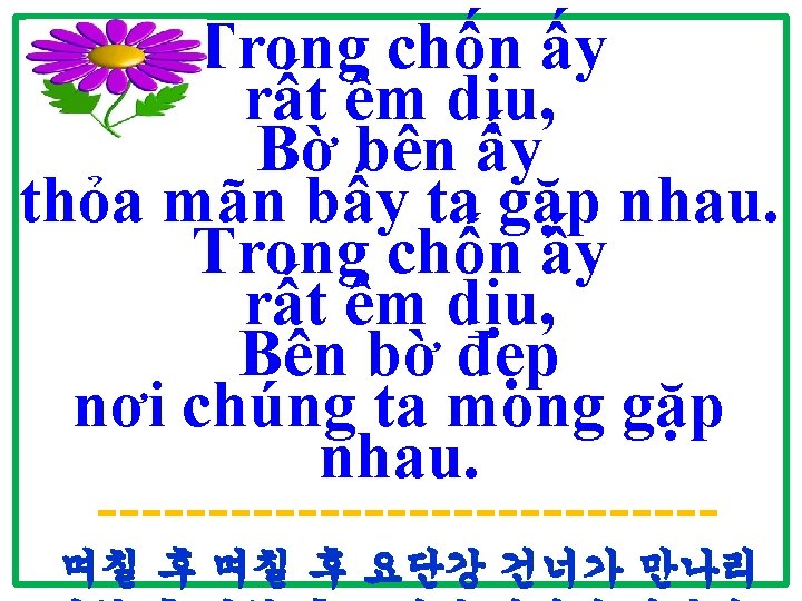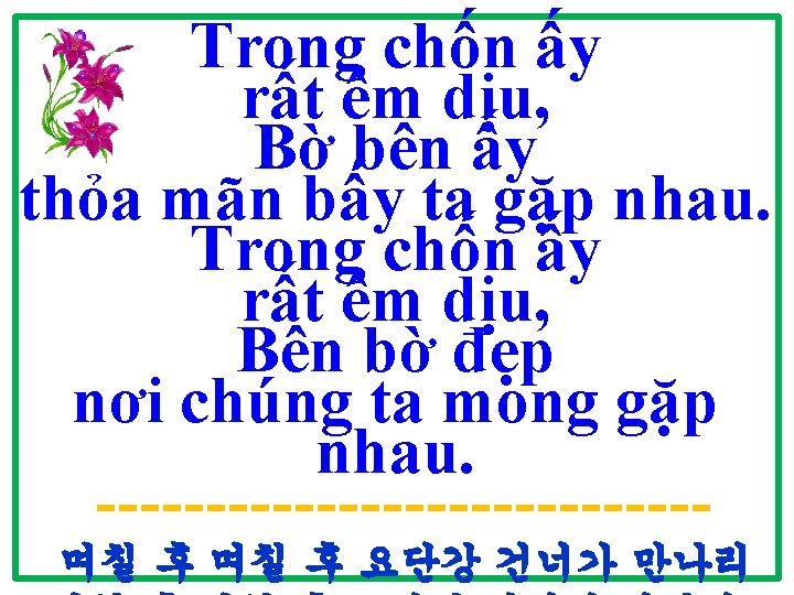 Trong chốn ấy rất êm dịu, Bờ bên ấy thỏa mãn bấy ta gặp nhau. Trong chốn ấy rất êm dịu, Bên bờ đẹp nơi chúng ta mong gặp nhau.