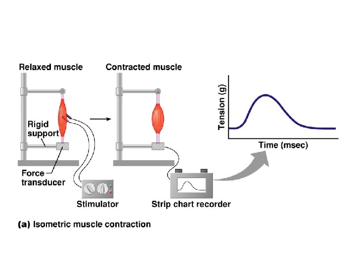Aspects mécaniques de la contraction Contraction isométrique (longueur constante) : le muscle se contracte contre une force sans que sa longueur diminue Ex : muscles qui maintiennent la posture, la contraction s’opposant alors à la gravité. Contraction isotonique : (tension constante) le muscle se raccourcit mais sa tension reste constante ex : les muscles se contractent pour produire un mouvement : la distance entre les points osseux se réduit, la tension restant constante.