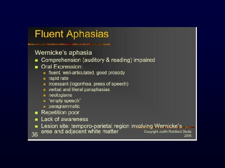 Fluent aphasia Wernike’s aphasia Nonsensible speech Not able to comprehend others speech Damage to unimodal association cortex in area 22 • Superior temporal gyrus • •