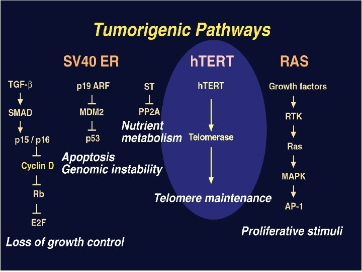 Telomerase allows ALT cells to form tumors h. TERT H-ras TUMORS GM 847 Immortal Expresses SV 40 Early region Lacks telomerase Stewart et al 2002