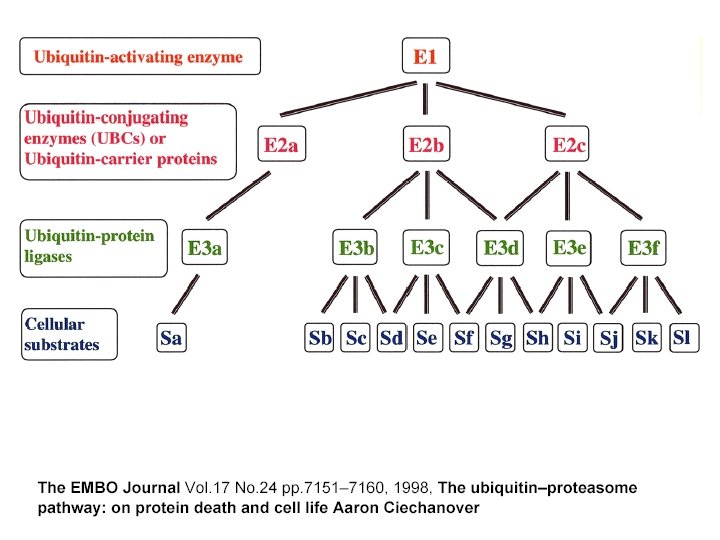 Ubiquitination of proteins is a FOUR-step process Ø First, Ubiquitin is activated by forming a link to “enzyme 1” (E 1). Ø Then, ubiquitin is transferred to one of several types of “enzyme 2” (E 2). Ø Then, “enzyme 3” (E 3) catalizes the transfer of ubiquitin from E 2 to a Lys e-amino group of the “condemned” protein. Ø Lastly, molecules of Ubiquitin are commonly conjugated to the protein to be degraded by E 3 s & E 4 s AMP