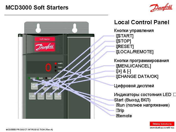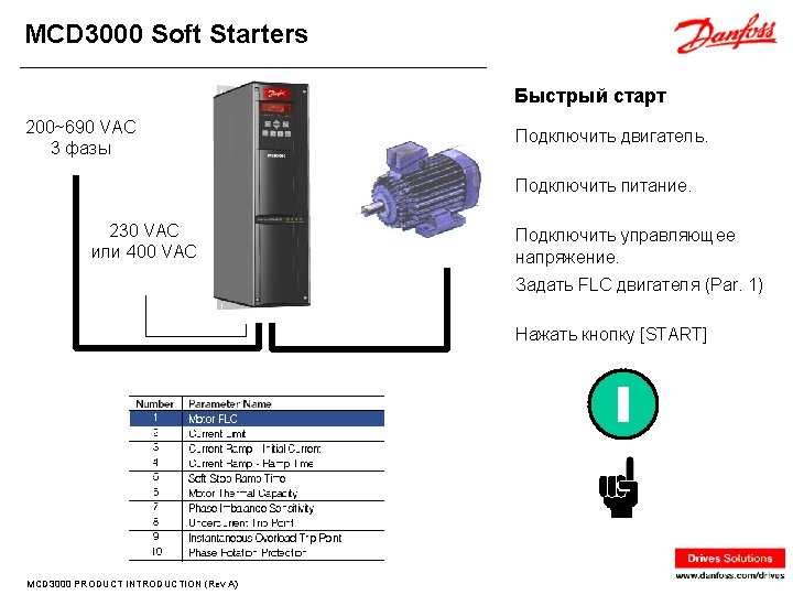 MCD 3000 Soft Starters Общая схема 3 PHASE SUPPLY RESET PARAMETER SET MOTOR THERMISTORS MCD 3000 PRODUCT INTRODUCTION (Rev A) OUTPUT B OUTPUT C SERIAL PORT STOP OUTPUT A PROGRAMMABLE RELAY OUTPUTS START REMOTE CONTROL INPUTS 230 V THERMISTOTS INPUT 400 V OR CONTROL SUPPLY VOLTAGE TO MOTOR RS 485 SERIAL INTERFACE Четыре управляющих входа � [START] � [STOP] � [RESET] � [PARAMETER SET] Два входа управляющего напряжения � 230 VAC или 400 VAC Вход для термистора (должен быть замкнут, если термистор на подключен) Три программируемых релейных выхода � 2 x Нормально открытых. � 1 x перебрасываемый RS 485 интерфейс