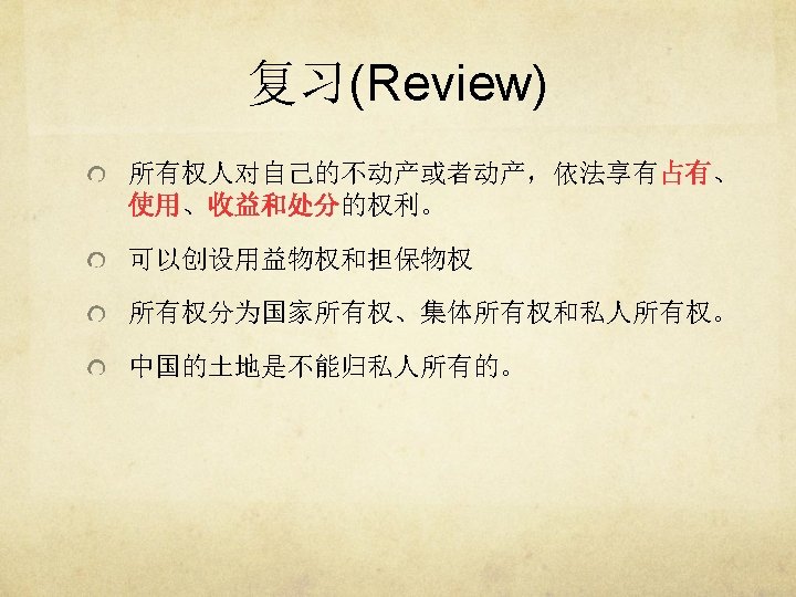 用益物权: 占有(possess)、使用(use)、收益 (seek profits) 所有权:占有(possess)、使用(use)、收益(seek profits)、处分(dispose)