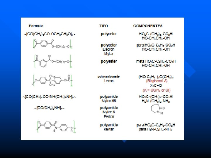 Polimerización por condensación n Requieren que por lo menos dos monómeros distintos participen de la reacción.