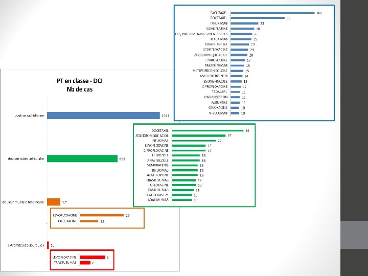 Discussion • 1 -Douleurs rachidiennes • Taxanes • Mécanisme cytotoxicité sur microtubules ? • Augmentation des cytokines proinflammatoires (IL) et flu syndrome • Infliximab Remicade® (PA, Crohn, psoriasis…) • Hypersensibilité de type III • Fluoroquinolones • 2 -Douleurs ostéoarticulaires • Taxanes • Acide zolédronique et biphosphonates • Inhibition du remodelage osseux • Augmention de fragilité osseuse ? • Fluoroquinolones • Inhibiteurs aromatase • 3 -Douleurs musculo-tendineuses • Fluoroquinolones