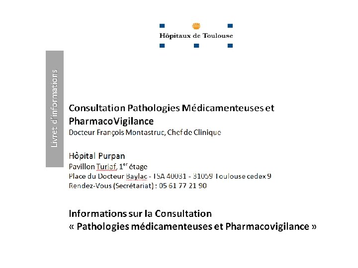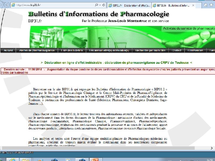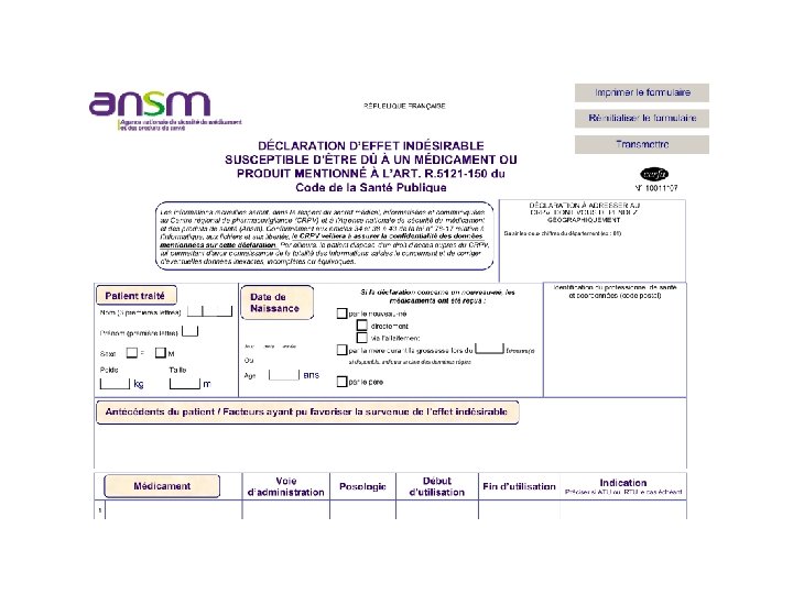 CRPV: 3 missions 1 -Service Clinique • « Service de Diagnostic et de Prise en Charge des patients souffrant d’EIM » • Informations indépendantes • Formation • « BUM » Bon Usage du Médicament • « Prescrire Juste au lieu de Juste Prescrire » 2 -Expertise de Santé Publique • « Pharmaco. Surveillance » • Recueil et validation des EIM, Agences (ANSM) 3 -Recherche Clinique