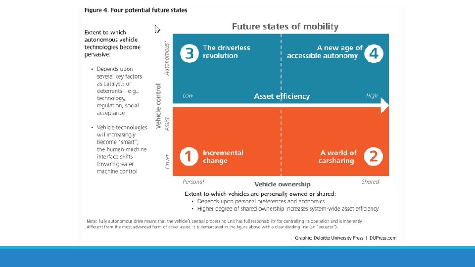 The Future of Mobility: How transportation technology and social trends are creating a new business ecosystem By Scott Corwin, Joe Vitale, Eamonn Kelly, Elizabeth Cathles September 24, 2015 Will technological advances and shifts in social attitudes lead to our no longer owning or driving vehicles? The global auto industry's transformation has farreaching implications for how we move from point A to point B and, in turn, affects carmakers, energy companies, insurers, health care, government funding, and more. Value shifts as a new ecosystem of mobility emerges.