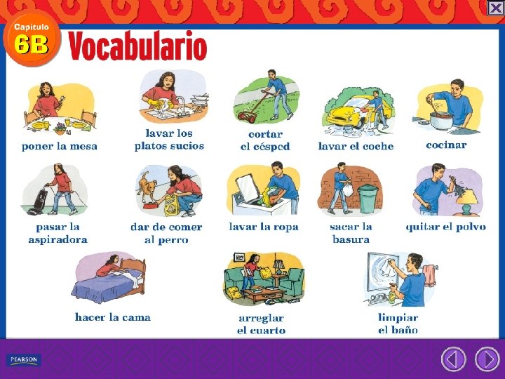 to name household chores arreglar el cuarto ayudar cocinar cortar el césped dar (yo doy, tú das) dar de comer al perro hacer la cama lavar (el coche, los platos, la ropa) to straighten up the room to help to cook to cut the lawn to give to feed the dog to make the bed to wash (the car, the dishes, the clothes)