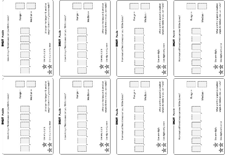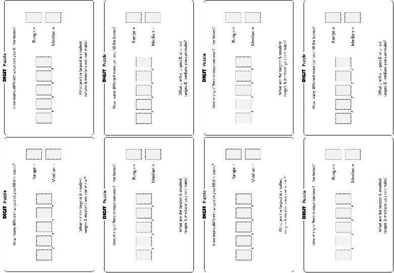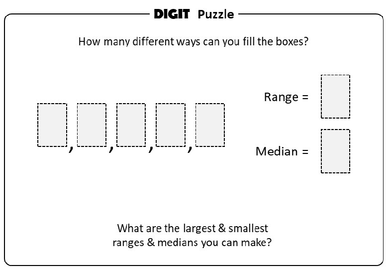 DIGIT Puzzle How many different ways can you fill the boxes? Range = , , Use any digits , Median = Range = , , , Use any digits What are the largest & smallest ranges & medians you can make? Use digits only once , , What are the largest & smallest ranges & medians you can make? Use digits only once DIGIT Puzzle How many different ways can you fill the boxes? Range = , Median = , , Use any digits Use digits only once , , Median = What are the largest & smallest ranges & medians you can make? Range = , , , Use any digits Use digits only once , , Median = What are the largest & smallest ranges & medians you can make?