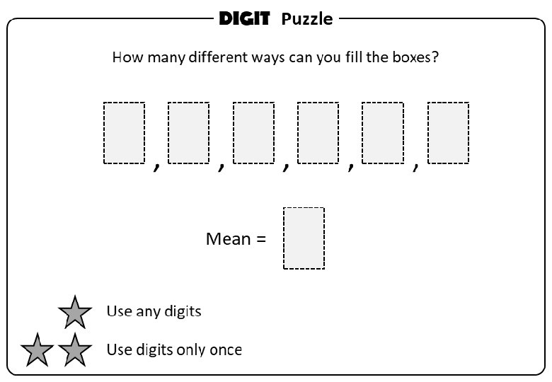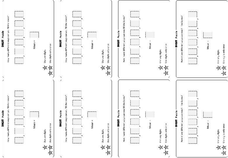 DIGIT Puzzle How many different ways can you fill the boxes? , , , Mean = Use any digits Use digits only once DIGIT Puzzle How many different ways can you fill the boxes? , , , Mean = , Mean = Use any digits Use digits only once , , ,
