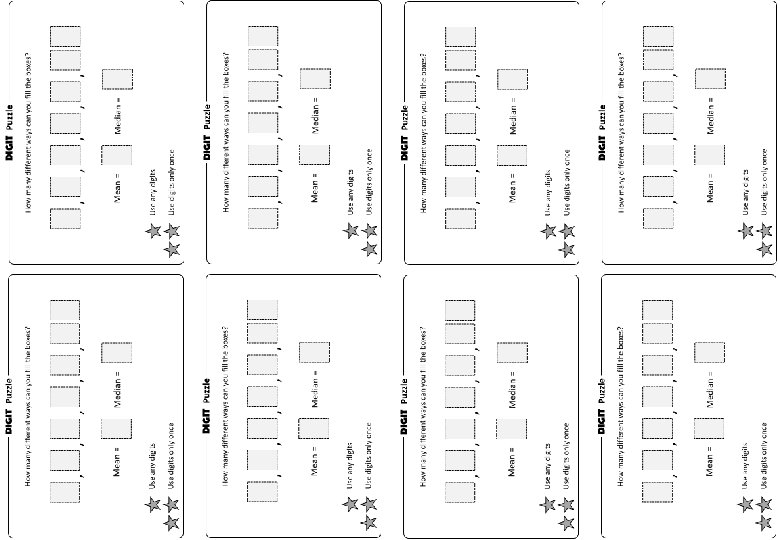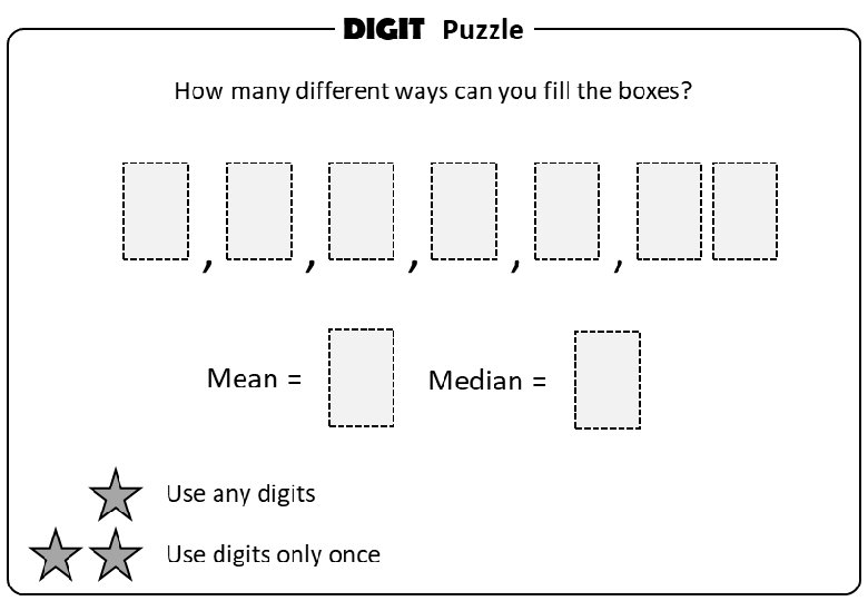 DIGIT Puzzle How many different ways can you fill the boxes? , , , Mean = Median = , , Median = Use any digits Use digits only once DIGIT Puzzle How many different ways can you fill the boxes? , , Mean = , , Median = , , , Mean = Use any digits Use digits only once , , Median = ,