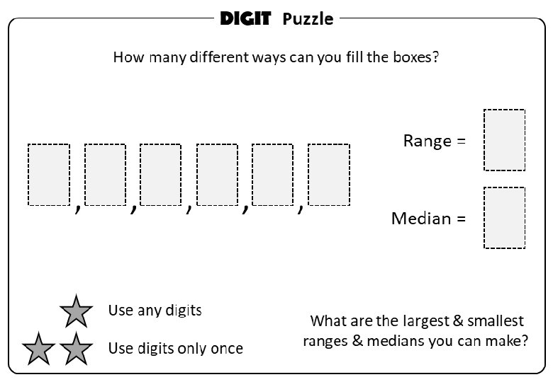 Mean, Median, Mode & Range – Digit Puzzle This activity is designed to allow investigation, strategizing & discussion. There are 4 puzzles in 2 sizes. Limited answers are given.