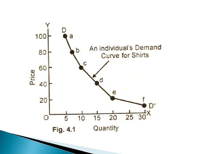 � In the figure (4. 1) the quantity demanded of shirts in plotted on horizontal axis OX and "price is measured on vertical axis OY. � Each price- quantity combination is plotted as a point on this graph. � If we join the price quantity points a, b, c, d, e and f, we get the individual demand curve for shirts. � The DD/ demand curve slopes downward from left to right. It has a negative slope showing that the two variables price and quantity work in opposite direction. � When the price of a good rises, the quantity demanded decreases and when its price decreases, quantity demanded increases, ceteris paribus.