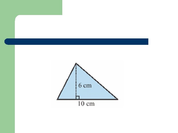 Triangle: Area = ½ x b x h Area = ½ x 10 x 6 = 30 cm 2 Area = ½ x 5 x 8 = 20 m 2 8 m 5 m