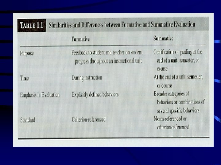SUMMATIVE EVALUATION • JUDGMENT OF ACHIEVEMENT AT THE END OF AN INSTRUCTIONAL UNIT OR PROGRAM • TYPICALLY INVOLVES TEST ADMINISTRATION AT THE END OF AN INSTRUCTIONAL UNIT OR TRAINING PERIOD • USED TO DECIDE IF BROAD OBJECTIVES HAVE BEEN ACHIEVED