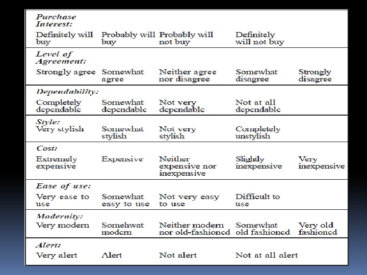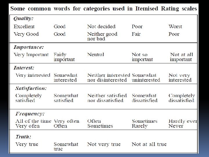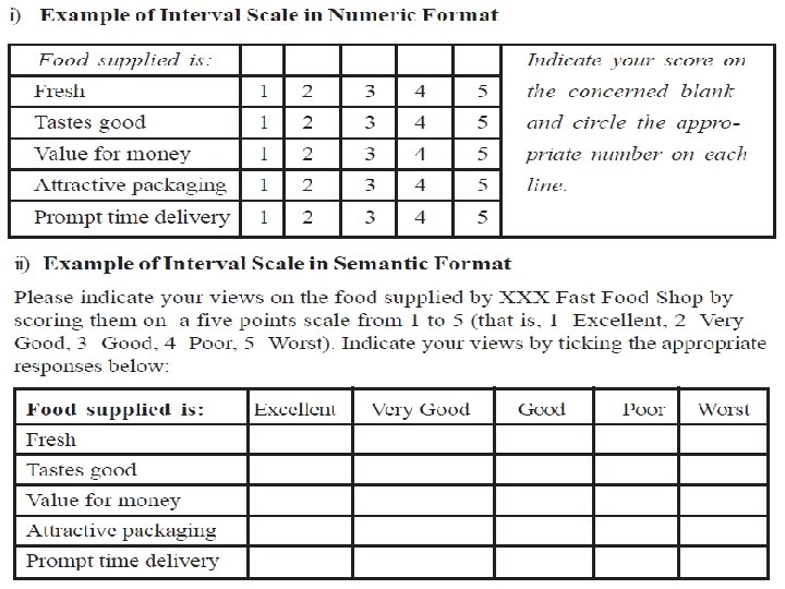 q Ordinal Scale q ranking of items along the continuum of the characteristic being scaled. q the items are classified according to whether they have more or less of a characteristic. q the categories have a logical or ordered relationship. This type of scale permits the measurement of degrees of difference, (i. e. ‘more’ or ‘less’) but not the specific amount of differences (i. e. how much ‘more’ or ‘less’). This scale is very common in marketing, satisfaction and attitudinal research. Using ordinal scale data, we can perform statistical analysis like Median and Mode, but not the Mean. For example, a fast food home delivery shop may wish to ask its customers: How would you rate the service of our staff? (1) Excellent • (2) Very Good • (3) Good • (4) Poor • (5) Worst •