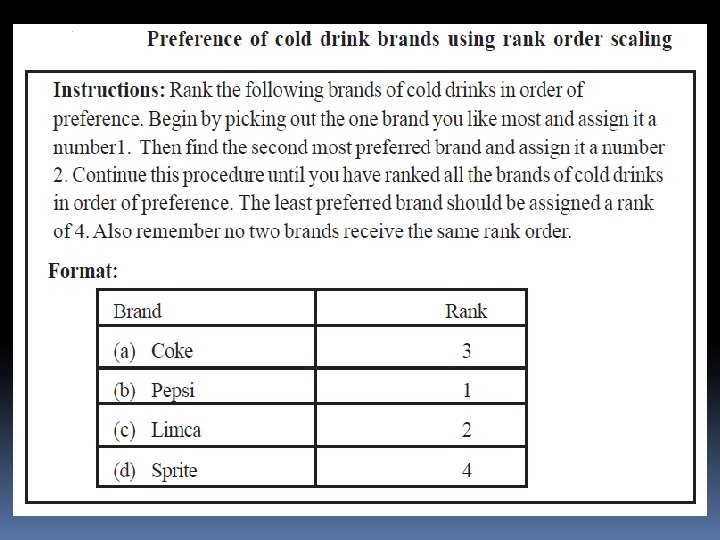 Rank Order Scale: This is another type of comparative scaling technique in which respondents are presented with several items simultaneously and asked to rank them in the order of priority. This is an ordinal scale that describes the favoured and unfavoured objects, but does not reveal the distance between the objects. The resultant data in rank order is ordinal data. This yields better results when direct comparison are required between the given objects. The major disadvantage of this technique is that only ordinal data can be generated.