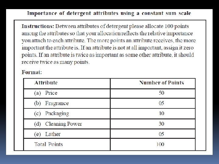 Constant Sum Scale: In this scale, the respondents are asked to allocate a constant sum of units such as points, rupees, or chips among a set of stimulus objects with respect to some criterion. For example, you may wish to determine how important the attributes of price, fragrance, packaging, cleaning power, and lather of a detergent are to consumers. Respondents might be asked to divide a constant sum to indicate the relative importance of the attributes. The advantage of this technique is saving time. However, main disadvantages are the respondents may allocate more or fewer points than those specified. The second problem is respondents might be confused.