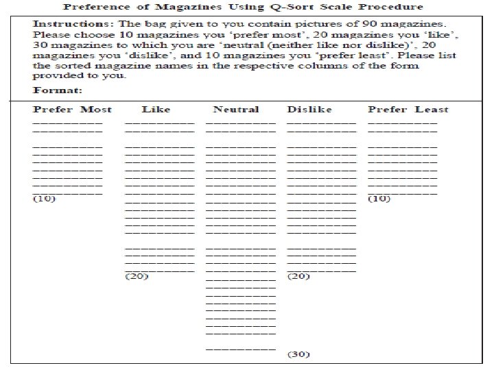 Q-Sort Scale: This is a comparative scale that uses a rank order procedure to sort objects based on similarity with respect to some criterion. The important characteristic of this methodology is that it is more important to make comparisons among different responses of a respondent than the responses between different respondents. Therefore, it is a comparative method of scaling rather than an absolute rating scale. In this method the respondent is given statements in a large number for describing the characteristics of a product or a large number of brands of a product.