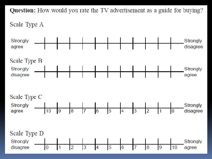 Continuous Rating Scales : It is very simple and highly useful. In continuous rating scale, the respondent’s rate the objects by placing a mark at the appropriate position on a continuous line that runs from one extreme of the criterion variable to the other. Example : Question: How would you rate the TV advertisement as a guide for buying?