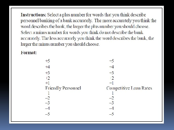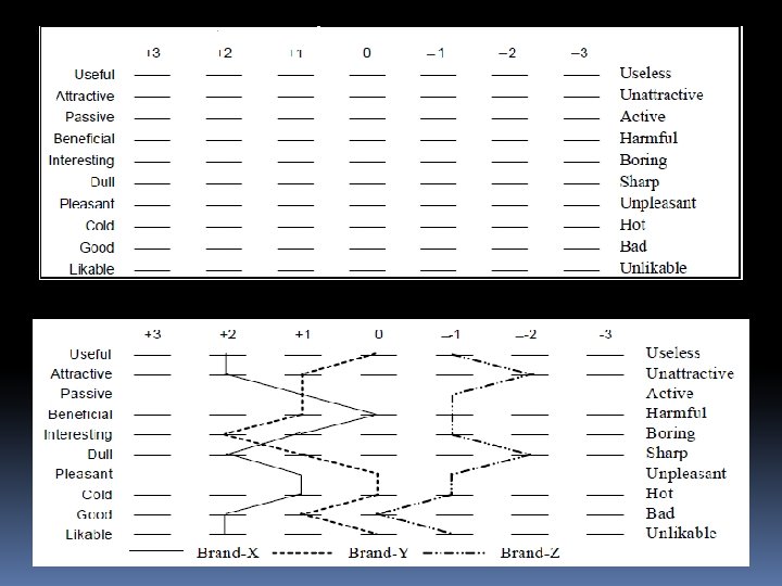 Semantic Differential Scale: This is a seven point rating scale with end points associated with bipolar labels (such as good and bad, complex and simple) that have semantic meaning. It can be used to find whether a respondent has a positive or negative attitude towards an object. It has been widely used in comparing brands, products and company images. It has also been used to develop advertising and promotion strategies and in a new product development study.