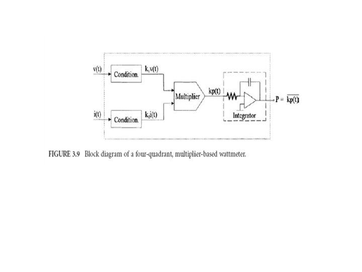 Wattmeters Based on Multipliers The multiplication and averaging processes (Figure 3. 8) involved in power measurements can be undertaken by electronic means. Electronic wattmeters fall into two categories: analog (continous) or discrete In continuous methods, multiplications are mainly carried out by means of analog electronic multipliers. In discrete methods, sampling wattmeters take simultaneous samples of voltage and current waveforms, digitize these values, and provide multiplication and averaging using digital techniques. Errors: 1. resistances of the voltage and current circuits have to be taken into account 2. phase errors of both current and voltage circuits increase the relative uncertainty of power measurement, 3. sinusoidal conditions.