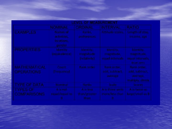 Not all numbers are equal!! • Stevens (1946) classified variables into four levels. • These are referred to as level of measurement, or levels of data. • Nominal • Ordinal • Interval • Ratio