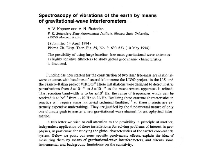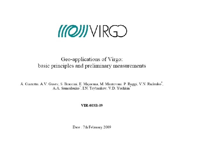 Conclusions • • • . Geophysical information from GW interferometers can be readout using compensation signal of circuits controlling the device operation regime. - besides due to parametric variations of FP resonance frequencies Geo - information might be received through the amplitude modulation of the free spectral range frequency filtered at the main interferometer output. Noise spectral density at the main output also is modulated by very slow (quasi static) variations of the interferometer base, produced by geophysics. It was demonstrated that VIRGO can be used as a two coordinate very long base strain meter. However the quality of the data strongly depends on a number of operational regime brakes during the observational time. Idea of measuring relative angular variations of mirror’s “plumb lines” for a sensing pure “gravity perturbations” up to now was not realized and requires a more detailed study.