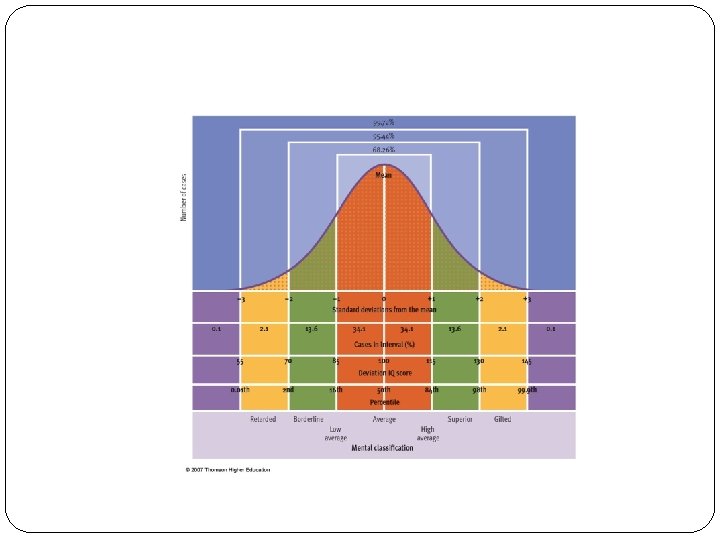Intelligence Classification according to IQ CLASSIFICATION IQ LIMITS PERCENT INCLUDED DEFECTIVE 65 AND BELOW 2. 2 BORDERLINE 66 -79 6. 7 DULL NORMAL 80 -90 16. 1 AVERAGE 91 -110 50 BRIGHT NORMAL 111 -119 16. 1 SUPERIOR 120 -127 6. 7 VERY SUPERIOR 128 AND ABOVE 2. 2