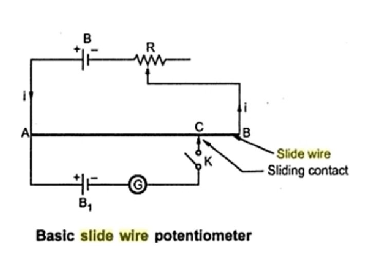 Principle of Operation • A basic potentiometer circuit consists of a slide wire AB of uniform cross section and Unit length. Generally slide wire is made up of manganin. Let r be the resistance per unit Length of slide wire. • The battery supplies a current through the slide wire which is limited with the help of regulating resistance i. e. rheostat. • The battery B 1 Whose e. m. f. is to be measured is connected in series with a galvanometer G and switch K. • When the switch K is opened, the current through slide wire is i. If the sliding contact is at position C, let the length AC be l Units, then the voltage drop across AC is given by ir 1.