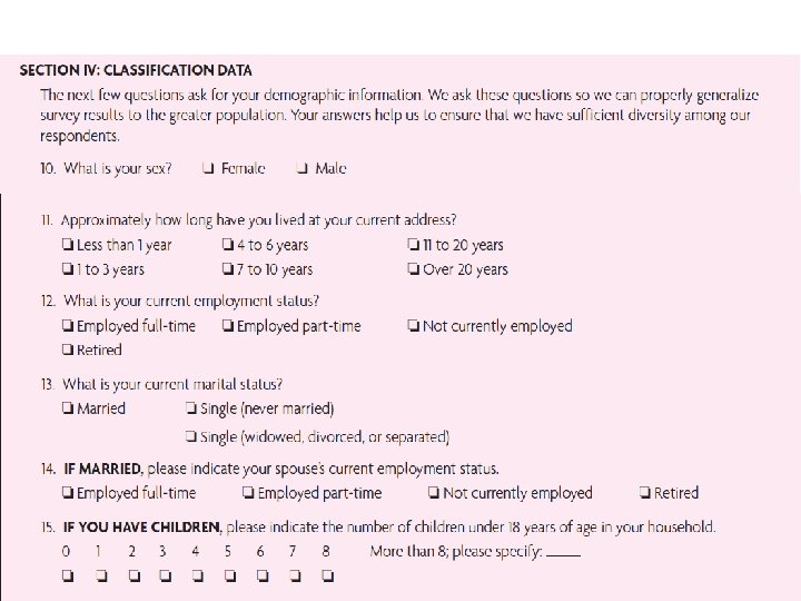 Step 3: Develop Questions and Scaling • Question format – Unstructured questions: Open-ended questions formatted to allow respondents to reply in their own words – Structured questions: Closed-ended questions that require the respondent to choose from a predetermined set of responses or scale points