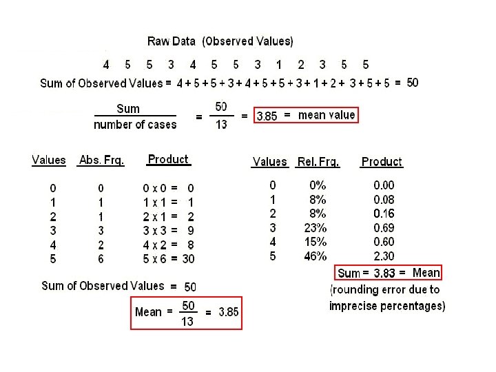 The Mean • The mean (or mean value) of a variable in a set of data is the result of adding up all the observed values of the variable and dividing by the number of cases (i. e. , the “average” as the term is most commonly used). • The mean is defined if and only if the variable is at least interval in nature [i. e. , interval or ratio]. • Suppose we have a variable X and a set of cases numbered 1, 2, . . . , n. Let the observed value of the variable in each case be designated x 1, x 2, etc. Thus: