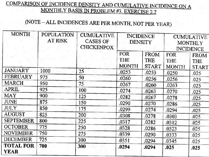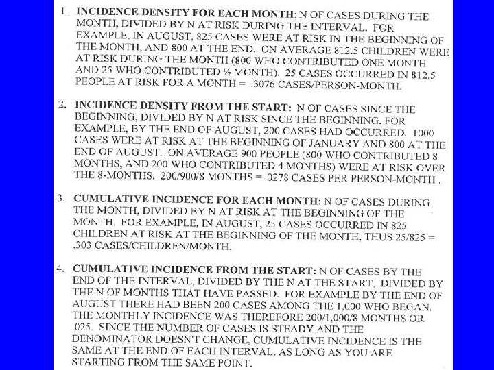 USES OF INCIDENCE DENSITY AND CUMULATIVE INCIDENCE • Incidence density gives the best estimate of the true risk of acquiring disease at any moment in time. • Cumulative incidence gives the best estimate of how many people will eventually get the disease in an enumerated population.