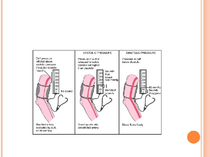 RECOMMENDED TECHNIQUE FOR MEASURING BLOOD PRESSURE* (CONT. ) Drop pressure by 2 mm. Hg / beat � Appearance of sound (phase I Korotkoff) = systolic pressure Drop pressure by 2 mm. Hg / beat � Disappearance of sound (phase V Korotkoff) = diastolic pressure Record measurement Take at least 2 blood pressure measurements, 1 minute apart *with manual or semi automated devices