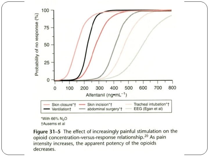 Mc. Ewan and coworkers found very similar results in humans. The maximal MAC reduction was 82% at a steady-state fentanyl plasma concentratio of 10. 6 ng/m. L. Similar MAC reduction results have been obtained with other inhaled anesthetics (desflurane, sevoflurane) and other opioids (alfentanil, sufentanil, remifentanil).