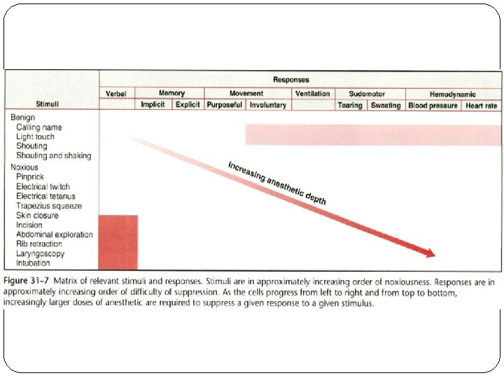 The most important is that for any stimulus response pair, depth of anesthesia is the probability of nonresponse. More generally, depth of anesthesia is the probability of nonresponse to stimulation, calibrated against the strength of the stimulus, the diffi. Culty of suppressing the response, and the druginduced probability of nonresponsiveness.