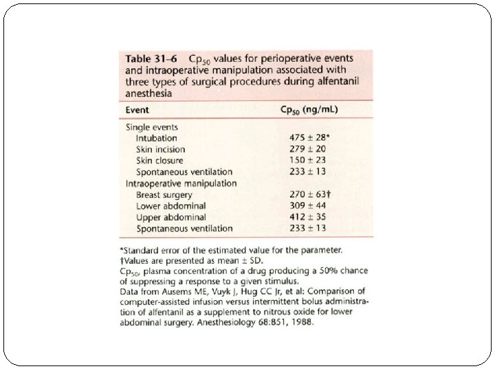 Kazama and coworkers found propofol CPso values for the following defined stimuli: loss of verbal responsiveness, electrical tetanus, laryngoscopy, skin incision, and intubation. With the addition of a steady-state fentanyl , there was only a minimal decrease in the propofol CPso for loss of verbal responsiveness. For the other, more intense noxious stimuli (tetanus, laryngoscopy, skin incision, and intubation), a much greater decrease in propofol CPso occurred.