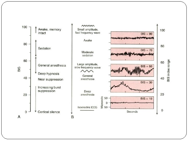 The device presents a continuous EEG parameter, the bispectral (BIS) index, which ranges from an awake, no-drugeffect value of 95 to 100 to zero with no detectable EEG activity.