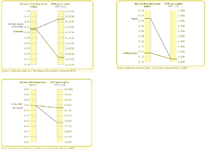 Measuring poverty and inequality has changed over time • Earlier ideas – income only GNP, GDP, PPP and the Brandt Line. • Moved on to social indicators and deprivation adult literacy, access to fresh water. • Later qualitative indicators concerned with, vulnerability, Inequality, Empowerment and human rights. • Happy Planet Index • Human rights international accountability index • Multi dimensional poverty Index (MPI)