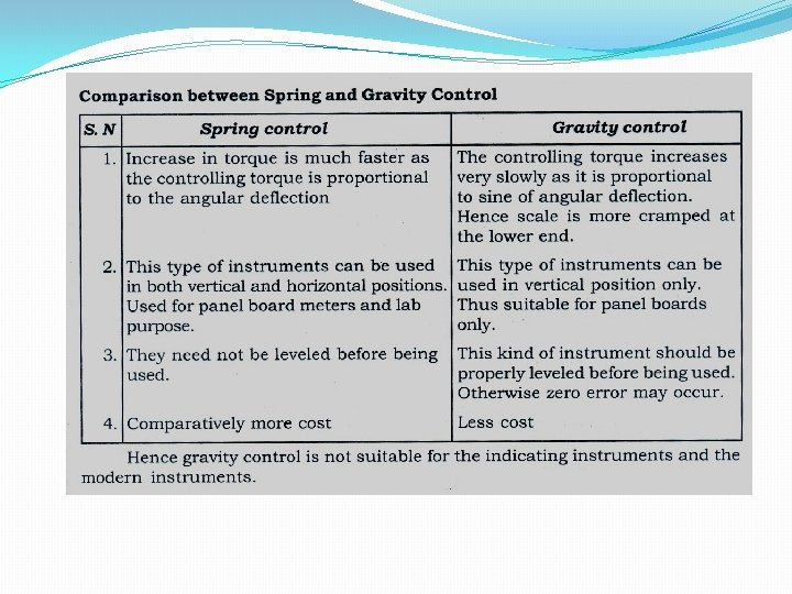The pointer is brought to rest at a position where the two opposing forces i. e. deflection and controlling forces are equal. Types of control system: 1. Spring control 2. Gravity control Spring Control: �When the pointer is deflected one spring unwinds itself while the other is twisted. This twist in the spring produces restoring (controlling) torque, which is proportional to the angle of deflection of the moving systems.