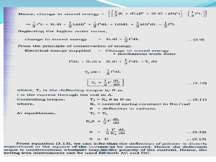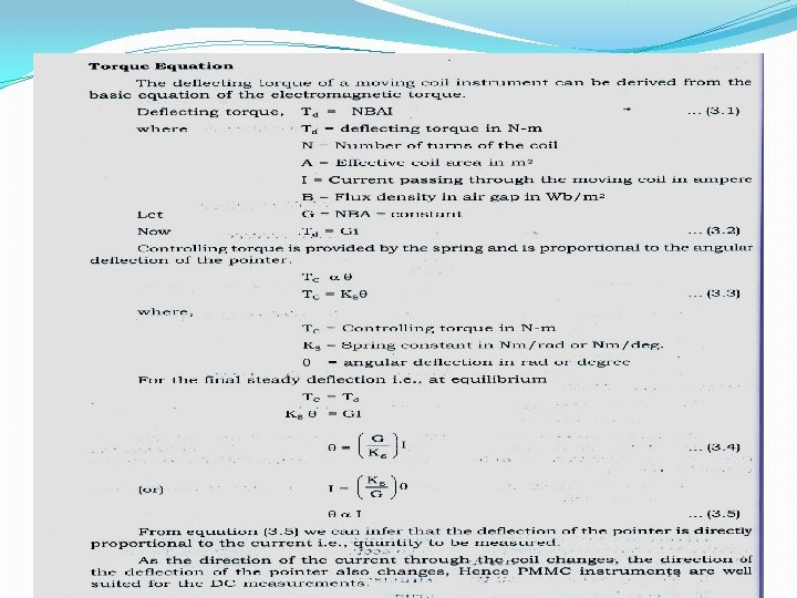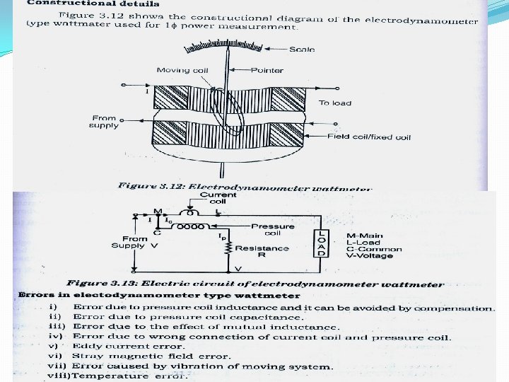 Errors: �Error due to variation in temperature. �Error due to friction is quite small as torque-weight ratio is high in moving coil instruments. �Stray fields cause relatively low values of magnetizing force produced by the coil. Efficient magnetic screening is essential to reduce this effect. �Error due to variation of frequency causes change of reactance of the coil and also changes the eddy currents induced in neighbouring metal. �Deflecting torque is not exactly proportional to the square of the current due to non-linear characteristics of iron material.