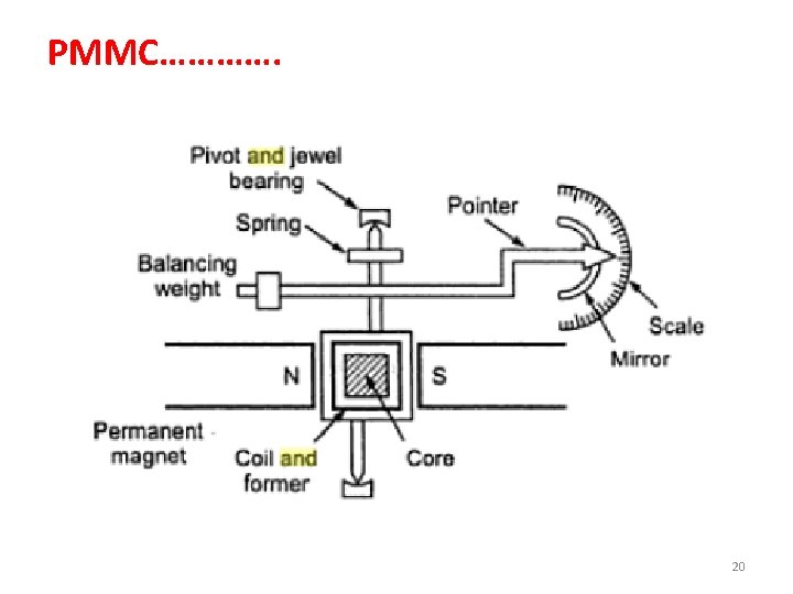 Construction: • A coil of thin wire is mounted on an aluminum frame (spindle) positioned between the poles of a U shaped permanent magnet which is made up of magnetic alloys like alnico. • The coil is pivoted on the jewelled bearing and thus the coil is free to rotate. The current is fed to the coil through spiral springs which are two in numbers. The coil which carries a current, which is to be measured, moves in a strong magnetic field produced by a permanent magnet and a pointer is attached to the spindle which shows the measured value. 19
