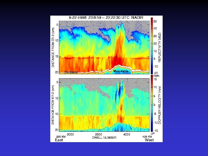ER-2 EDOP Doppler Radar Frequency / Wavelength: Peak Transmit Power Pulse Repetition Frequency Pulse Widths/Range Resolution Antenna Beam Widths 9. 72 GHz / 3. 07 cm 20 k. W 2. 2 of 4. 4 k. Hz 0. 25, 1. 0 micro-sec / 37. 5, 150 m 2. 9 deg