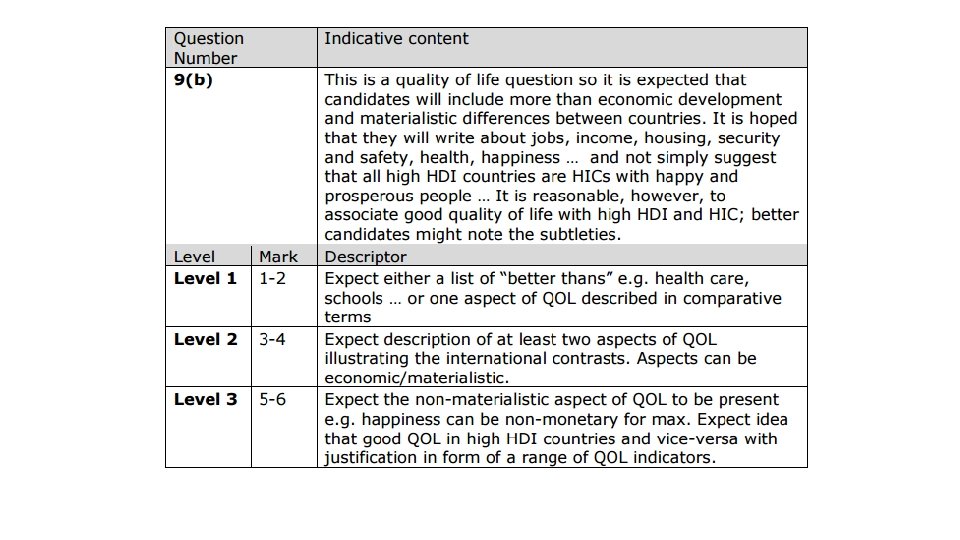 Marking criteria – Peer Assessment • Names and gives suitable examples of LIC/HIC • Uses several relevant (Qo. L) indicators to explain differences, such as life expectancy, low levels of crime, gender equality • Makes point that Qo. L is more than just economic development, it can indicate happiness, life satisfaction etc • Uses good connective language to explain key differences e. g. ‘whereas’, ‘therefore’, ‘this means that’… • Each point is well developed and uses appropriate terminology and correct grammar etc