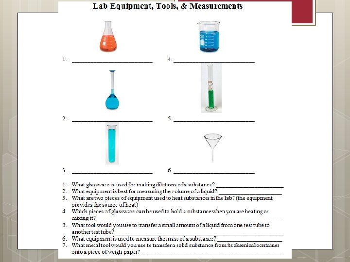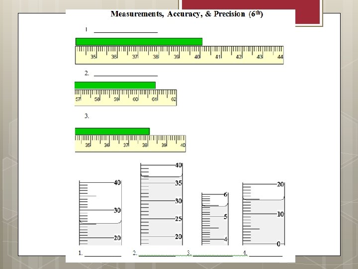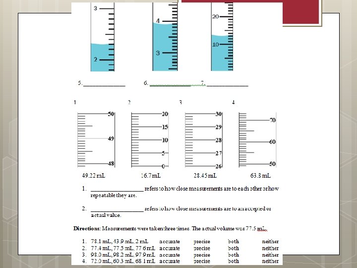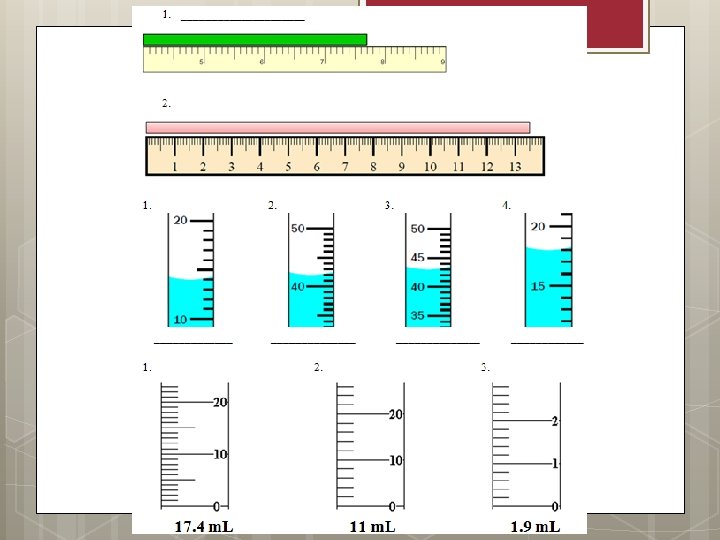 Taking Measurements Volume Practice reading the volumes in the graduated cylinder below: