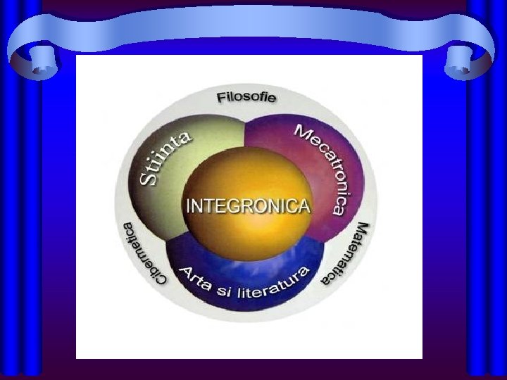 • Mecatronica s-a extins şi în alte domenii: hidronica, pneutronica, termotronica, autotronica, agromecatronica(agricultura de precizie); • Evoluţia în dezvoltarea tehnologică înseamnă: micromecatronică, nanomecatronica, biomecatronica; • Tendinţa generalăeste de “intelectualizare a maşinilor şi sistemelor. INTEGRONICA ŞI MECATRONICA • Integronica este ştiinţa proceselor de integrare şi a sistemelor hiperintegrate, aşa cum este organismul uman. Ea ţine seama de unitatea indisolubilă a lumii în care trăim şi necesitatea unei perspective unice asupra acestei lumi. Conceptul este ilustrat mai jos. • Unitatea ştiinţa, tehnologia, arta, literatura se realizează în cadrul definit de matematică, cibernetică şi filosofie.