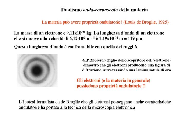 Luis De Broglie ipotizzò che, come la luce possiede proprietà corpuscolari e ondulatorie, tutta la materia avesse anche proprietà ondulatorie: a un corpo con quantità di moto p= mv si può di fatto associare una lunghezza d’onda: