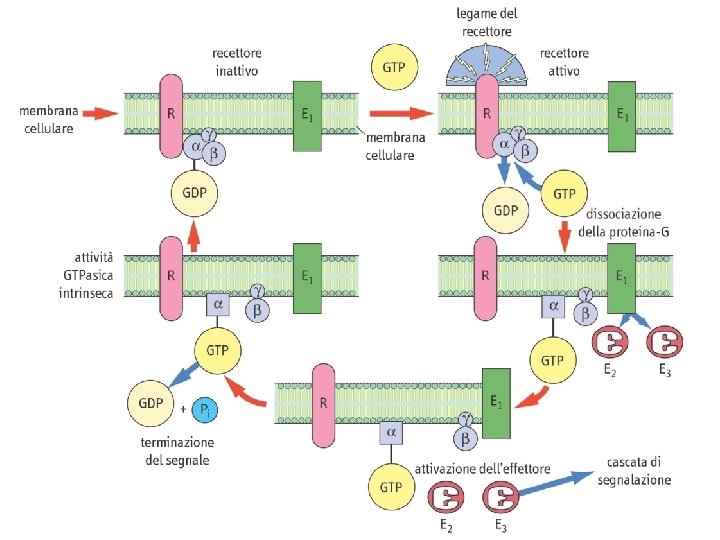 Classi e funzioni di proteine G Classe Tipo Gs αs Glucagone, β-adrenergici ↑ Adenilato ciclasi Gluconeogenesi Lipolisi, glicogenolisi αolf Olfattorio ↑ Adenilato ciclasi Senso dell'olfatto α 11 Acetilcolina ↓ Adenilato ciclasi ↓ frequenza cardiaca α 12 α 2 -Adrenergici ↑ Canali del potassio Gi Stimolo Effettore Effetto M 2 colinergici Gq G 12 α 0 Oppiodi, endorfine ↑ Canali del potassio ↓ Canali del calcio Attività elettrica neuronale αt Luce ↑ c. GMP fosfodiesterasi Visione αq M 1 colinergici α 11 α 1 -Adrenergici ↑ Fosfolipasi C- β 2 ↑ Contrazione muscolare α 1 -Adrenergici ↑ Fosfolipasi C-β 1 ↑ pressione ematica α 12/13 Vari: ac. lisofosfatidico Vari: GTP-binding protein Rho vari § Le quattro principali sottofamiglie di proteine G di mammifero (Gs, Gi, Gq e G 12) sono distinte in base all'omologia di sequenza. § La tabella riporta i membri rappresentativi di ognuna delle classi § Si conoscono oltre 20 differenti tipi di subunità α, 6 subunità β, 12 sub γ