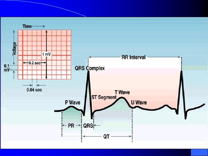 ECG Time & Voltage • • • ECG machines can run at 50 or 25 mm/sec. Major grid lines are 5 mm apart; at standard 25 mm/s, 5 mm corresponds to. 20 seconds. Minor lines are 1 mm apart; at standard 25 mm/s, 1 mm corresponds to. 04 seconds. Voltage is measured on vertical axis. Standard calibration is 0. 1 m. V per mm of deflection.